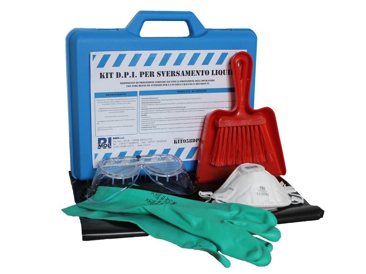 I Kit DPI per sversamento liquidi della linea Protezione di Rimol srl sono la soluzione ideale per la gestione dei rischi legati allo spandimento accidentale di prodotti liquidi.