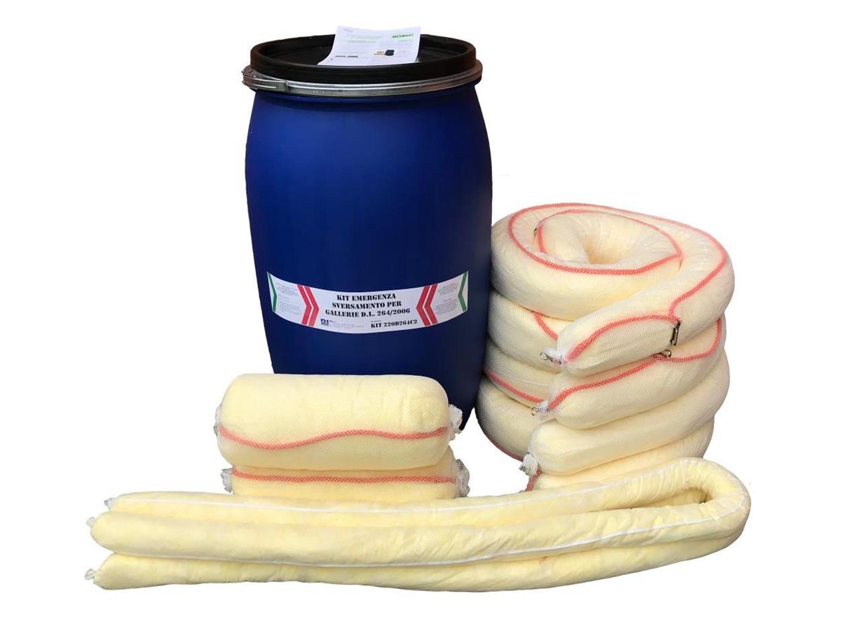 Kit contenente dispositivi assorbenti per contenere sversamenti in spazi delimitati in ottemperanza al DECRETO LEGISLATIVO 5 ottobre 2006, n. 264. Attuazione della direttiva 2004/54/CE in materia di sicurezza per le gallerie della rete stradale transeuropea. (GU Serie Gen. n.235 del 09-10-2006 - Suppl. Ordinario n. 195).